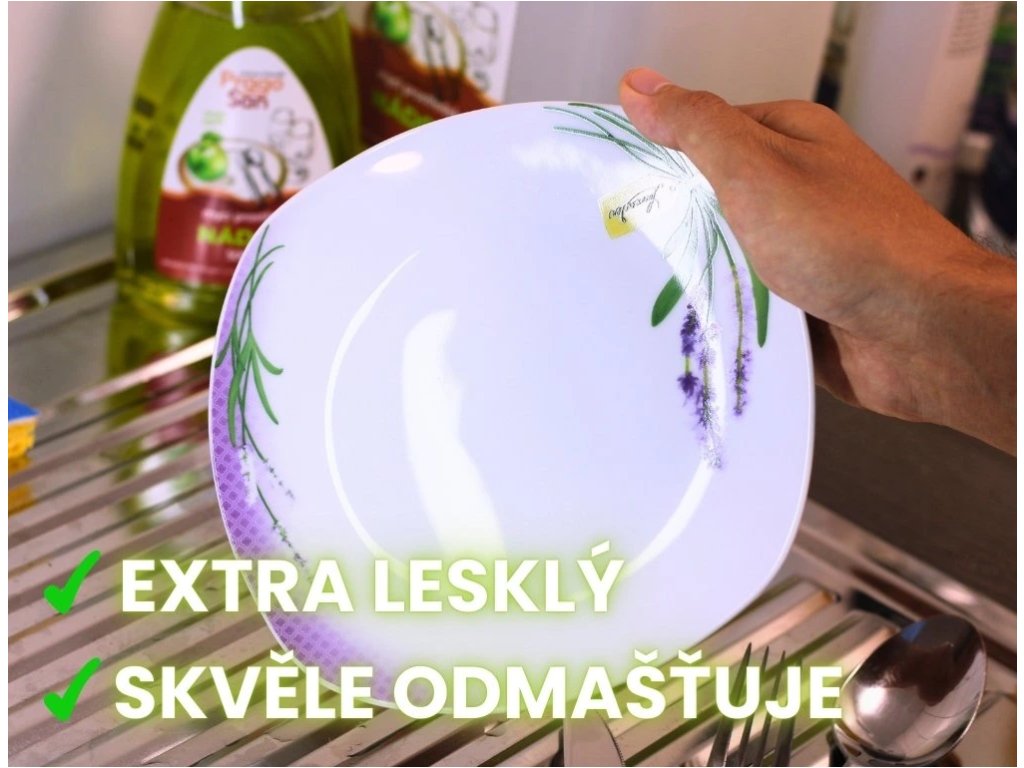 Perfektní na sklo, talíře, příbory i hrnce – nádobí nechává krásně čisté a lesklé.